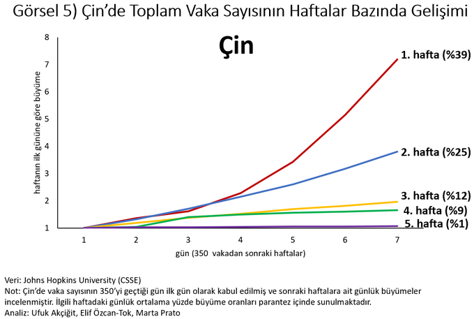 Virüsle ilk karşılaşan ülke olan Çin’in bu patikadan nasıl çıktığını anlamak gerekiyor. Grafik 5, vaka sayısı 350’yi geçtikten sonraki 5 hafta için, her günkü vaka sayısını, o hafta başındaki vaka değerine bölüyor. Dolayısıyla, her güne ait hafta başına göre bir büyüme oranı elde ediliyor. Hafta başındaki değer kendine bölündüğü için 1’e eşit oluyor. Sonuç olarak, Çin, 5 hafta boyunca büyüme oranını g=%39’dan g=%1’e kadar indirmeyi başarmış. Peki Türkiye’de durum nasıl?